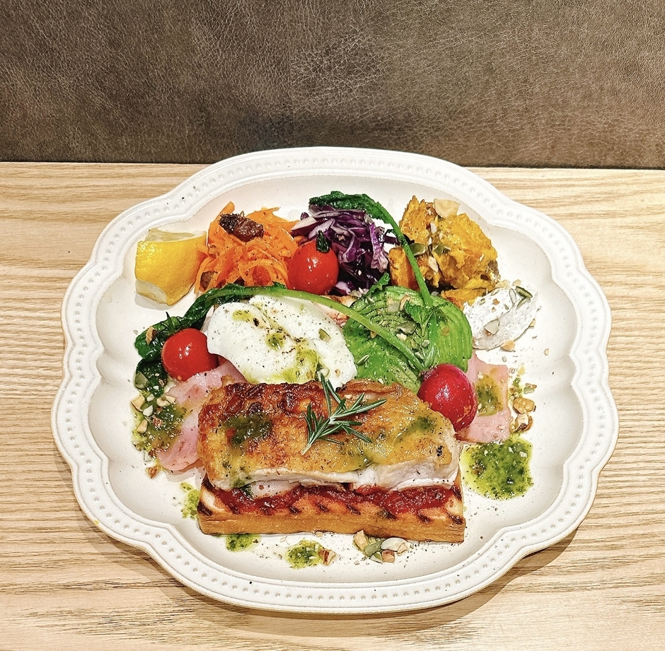 錦爽どりのしっとりとジューシーな旨みとベーコンを合わせ、食べ応えのあるオープントーストに仕上げました。彩り豊かな野菜と合わせ、味の変化も楽しめる一品です。