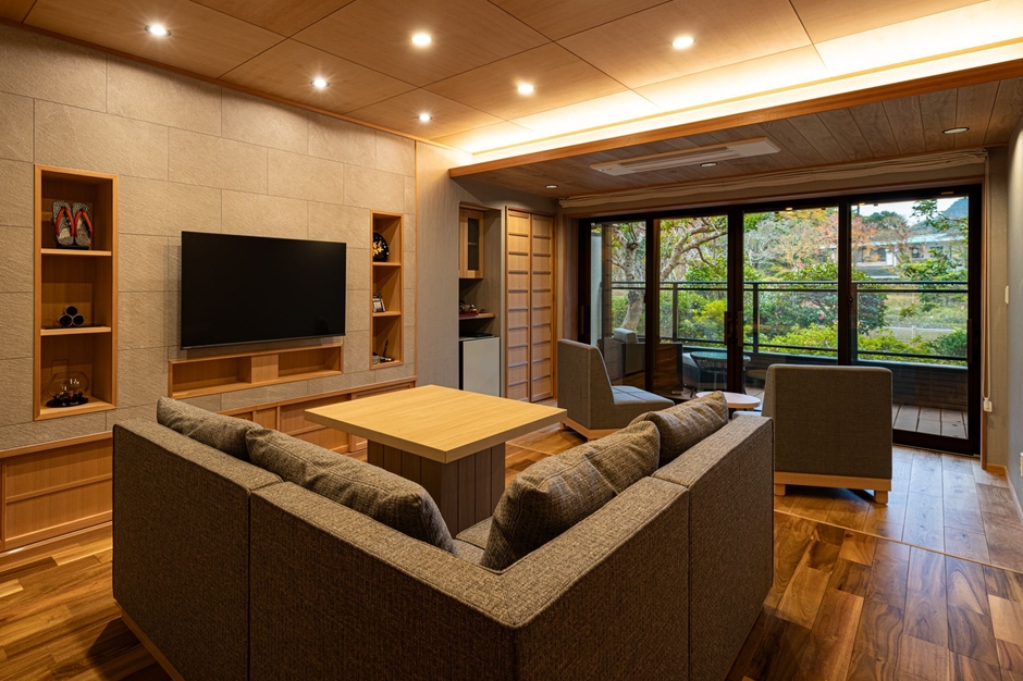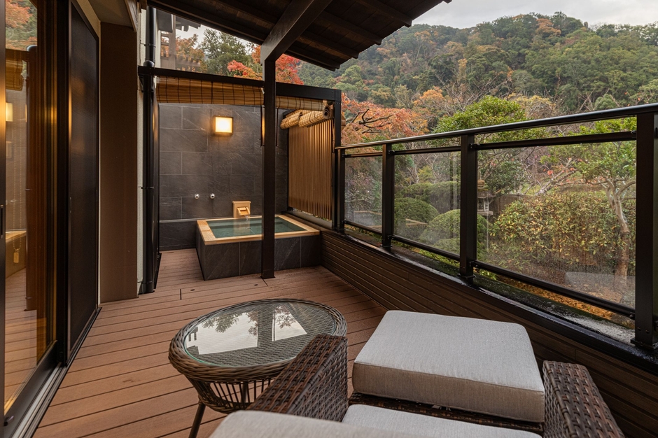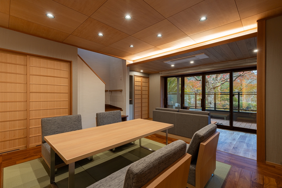 今回のリニューアルにより、お部屋が上下二層に分かれるメゾネットタイプの客室が新たに誕生いたしました。1階にはリビング、2階には寝室をご用意しており、どちらからでも緑豊かな眺望をお愉しみいただける空間を実現いたしました。夕食はプライベートを重視したインルーム(部屋食)で、心ゆくまでお食事と美酒をご堪能いただけます。客室テラスには源泉かけ流しの露天風呂も備えており、川音に包まれた癒しの時間を贅沢にお過ごしいただけます。