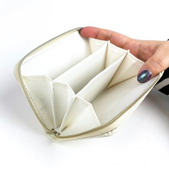 ファスナーを開くと、ジャバラ状のコインケースが。3ヵ所に分かれているので、仕分けもできちゃいますね。折りたためばお札も入るので、まさにこれ一つでOK
