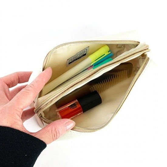 ファスナーを開けると3つに仕切られたポケットがある、人気のタイプです。