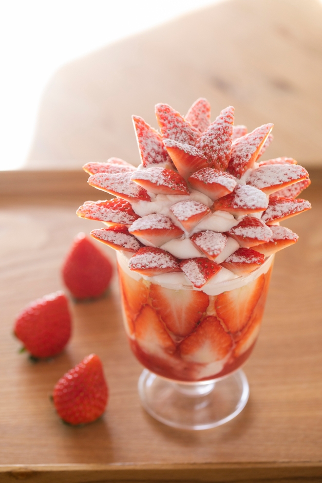インパクト大の見た目、新作いちごパフェの「トゲトゲボンボン」。たっぷり10粒以上のいちごを使用し、グラスの中には自家製レアチーズケーキやミルクプリン、自家製いちごジャムなどを入れました。旬に入り、甘みが増してきたいちご。レアチーズケーキのさっぱりとした酸味が、甘くジューシーないちごと相性抜群です。
