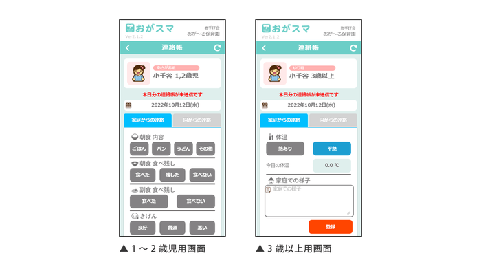 新潟県様式の「連絡帳」の特徴として0歳児の [ 睡眠・排便・食事 ] の入力が細かにできるものとなっております。