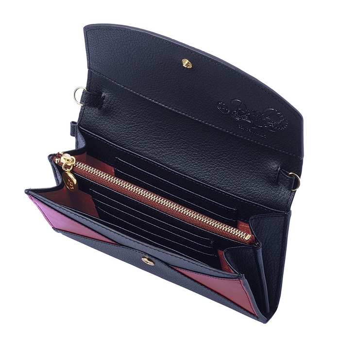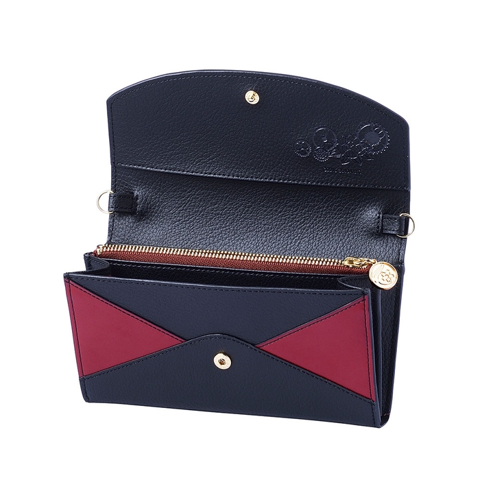 内装は坂口のコスチュームをイメージした柄をベースに機能性のある仕切りポケット、蓮の花と歯車をさりげなく型押ししました。