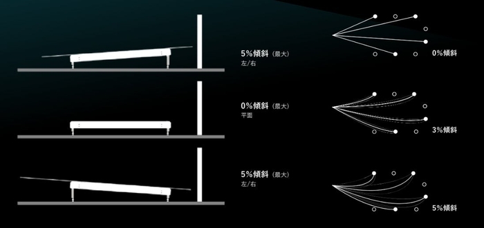 フランス発祥のパッティングに特化したシミュレーターです。専用タブレットを用いて操作します。サイズは5.5m×2.2m。大きな特徴として2点あり、1つは台自体に傾斜を自在に付けられリアルなグリーンを再現できます。そしてもう1つはホールに向かってのガイドラインを投影できるところです。