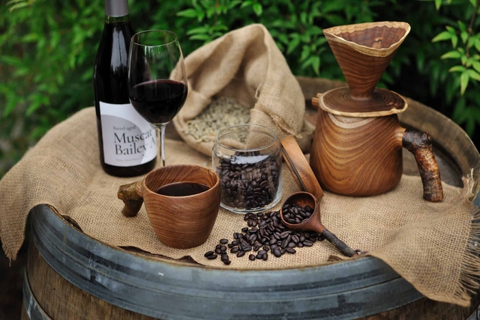 使用するコーヒー豆は、「猿田彦珈琲」協力のもと、コーヒーの生豆をワイン樽に一定期間貯蔵して寝かせ、ワインの香りをまとわせたバレルエイジドコーヒーです。一般的には、ウイスキー樽で作られることが主流ですが、星のや富士では、ワイン生産量1位を誇る山梨で作られた、マスカットベーリーAのワイン樽で寝かせたオリジナルのコーヒー豆を使用します。香りや風味のニュアンスが近いコーヒー豆をワイン樽で寝かせることで、マスカットベーリーA特有のベリーを連想させる赤い果実のような香りや、ワイン樽の樽香がコーヒー豆に加わり、通常のフレーバーコーヒーとは一味違う、より奥深い味わいのコーヒーに仕上がります。コーヒーの持つ香りとワイン樽の香りの相乗効果によって生まれる唯一無二のフレーバーを味わいます。