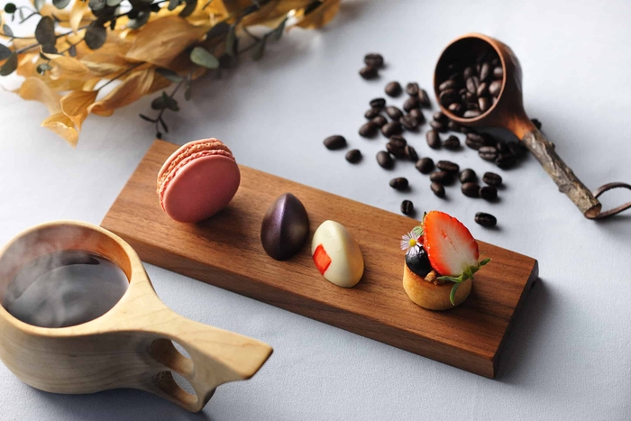 コーヒーを味わった後は、ワイン香るコーヒーに合わせたフードペアリングを体験します。コーヒーと食材の相性や、味わいの変化を感じていただくために用意するのは、3種の小菓子です。甘酸っぱい味わいの苺のタルトや、赤ワインジュレが入ったチョコレートと組み合わせることで、コーヒーに含まれるワインのニュアンスを堪能することができます。また、コーヒーの奥深く香ばしい味わいには、ほろ苦さや香ばしい味わいをもつキャラメルとクルミのマカロンを合わせます。森の中で、鳥のさえずりや風の音を聞きながら、コーヒーとのフードペアリングを堪能し、日々の暮らしに取り入れられるコーヒーの楽しみ方を発見することができます。