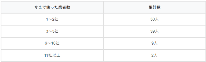 今まで使ったことがある海外FX業者の数もアンケートを取りましたが、1~2社の人が50人となり、ほとんどの人が業者をそこまでたくさんは使っていないことが分かりました。