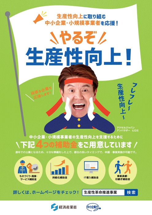 応援団長に扮したイラストなど、ヒロミさんの写真を活用して中小企業施策ごとに制作されたチラシやポスターなどは、全国の経済産業局、内閣府沖縄総合事務局、独立行政法人日本貿易振興機構(JETRO)の国内拠点、独立行政法人中小企業基盤整備機構(中小機構)の地域本部・事務所など全国73拠点のほか、各公式サイトなどで本日より順次掲出されます。「アクセルジャパン」を活用したPRツールが、日本全国の中小企業の皆様の目に触れ、中小企業施策の利用につながることで、成長をより一層支援できるものと考えております。
