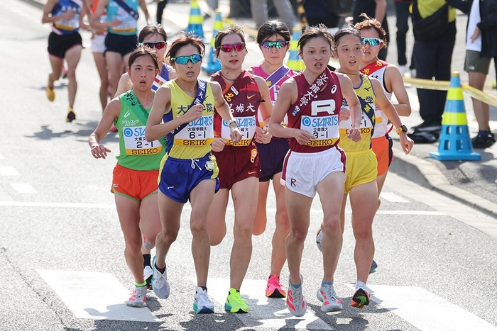 最長9.2kmの5区は原田紗希選手(法学部3年)が担当。この区間には前回大会区間賞のサラ・ワンジル選手(大東文化大学2年)や、10000m学生記録保持者の不破聖衣来選手(拓殖大学4年)、ワールドユニバーシティゲームス5000m銅メダリストの山﨑りさ選手(日本体育大学4年)など、実績を誇る各校のエースが集まった。