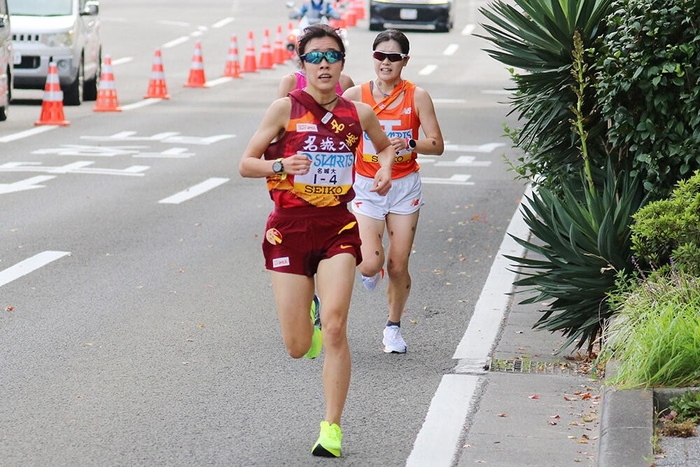 4.8kmの4区は、瀬木彩花選手(法学部2年)が名城大学のユニフォーム姿で駅伝デビュー。たすきを受け取った時点で21秒差以内に3チームが前を走っており、その背中を追いかけた。大阪学院大学、東北福祉大学をかわして5位に順位を上げ、区間4位の15分57秒でリレー。