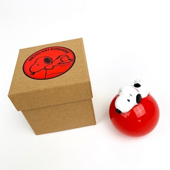 赤くて丸いフォルムの本体に、スヌーピーが乗っかったオキアガリコボシです。