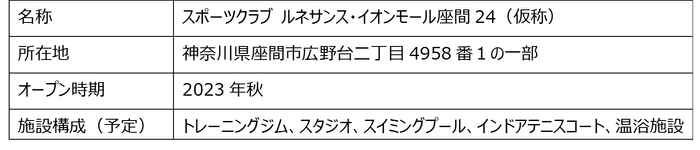 株式会社ルネサンス(代表取締役社長執行役員:岡本利治、本社:東京都墨田区)は、2023年秋に「スポーツクラブ ルネサンス・イオンモール座間24(仮称)」を、神奈川県座間市に出店することといたしましたので、下記の通りお知らせいたします。