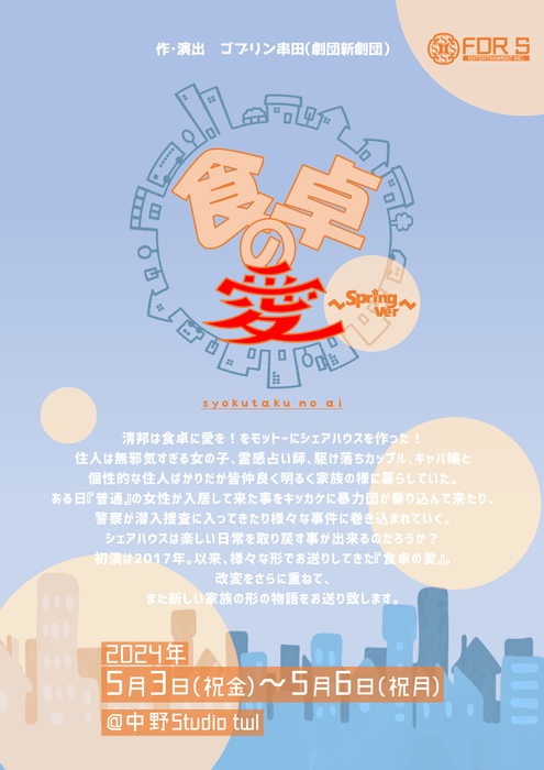 本公演は、フォーエスエンターテインメント×ゴブリン串田(劇団新劇団)のプロデュース企画です。 会場は中野で25年の歴史を誇る小劇場中野studio twl。 経営交代してからは、初の劇場主催での舞台公演となります。 作品は2017年の初演以来、様々な形でお送りしてきた『食卓の愛~Spring Ver~』。