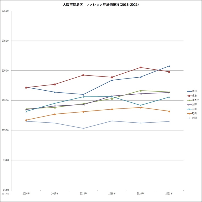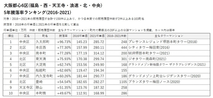 「不動産×WEB×ビッグデータ」の領域で、さまざまな不動産テックサービスを展開する株式会社ワンノブアカインド(本社:東京都港区、代表取締役社長:川島 直也、以下当社)は、当社が運営するマンション情報サイト「マンションレビュー」の保有データを元に、「大阪都心6区(福島区・西区・天王寺区・浪速区・北区・中央区」の各町名における、中古マンション相場および2016年からの相場推移について調査。最新の中古マンション価格*1とあわせて、2016年の坪単価と比較した騰落率のランキングを発表いたします。