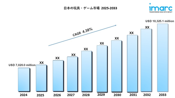 IMARCグループの最新の調査出版物「日本の玩具・ゲームの市場規模、シェア、動向、製品タイプ別、流通チャネル別、地域別予測 2025-2033」によると、日本の玩具・ゲームの市場規模は2024年に70億2,000万米ドルに達しました。今後、IMARCグループは、2025年から2033年の間に4.38%の成長率(CAGR)を示し、2033年までに市場が103億2,510万米ドルに達すると予想しています。