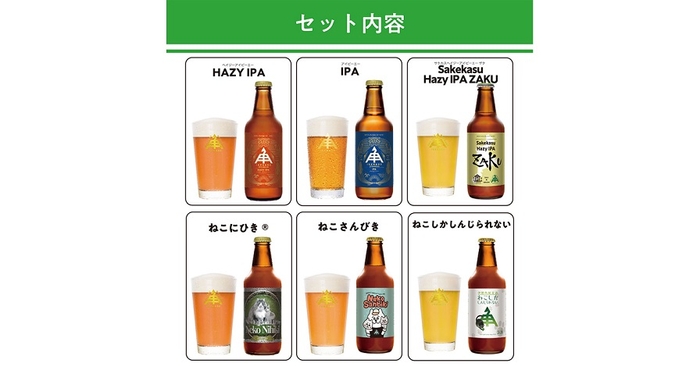 ①HAZY IPA ②IPA ③Sakekasu Hazy IPA ZAKU ④ねこにひき ⑤Neko Sanbiki ⑥ねこしかしんじられない
