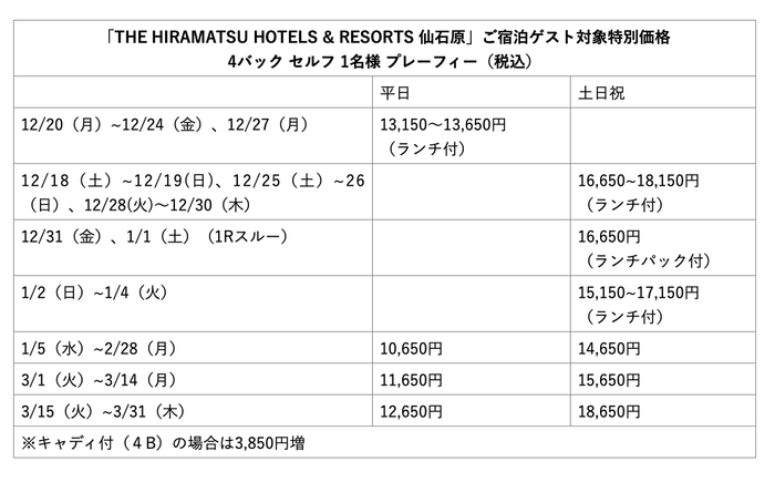 「THE HIRAMATSU HOTELS & RESORTS 仙石原」にご宿泊のお客様を対象に、太平洋クラブ「御殿場ウエスト」を特別価格でご利用いただけます。今年12月~来年3月のプレーフィーは、4バックセルフで1名様平日10,650円~、土日祝14,650円~、年末年始料金も平日扱い13,150円~、土日祝扱い16,650円~と魅力的な価格でのご提供です。ラグジュアリーな空間とおもてなしが叶える、心に残るゴルフ旅をぜひお愉しみください。