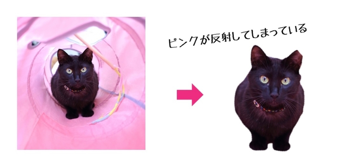 切り抜き加工した際に、背景は無くなってしまうため、猫ちゃんに不自然な反射色が残ってしまいます。青、赤、ピンクなど濃い色が周囲に写り込んでいる場合は、猫ちゃんのお顔やら体に反射していないか確認しましょう。