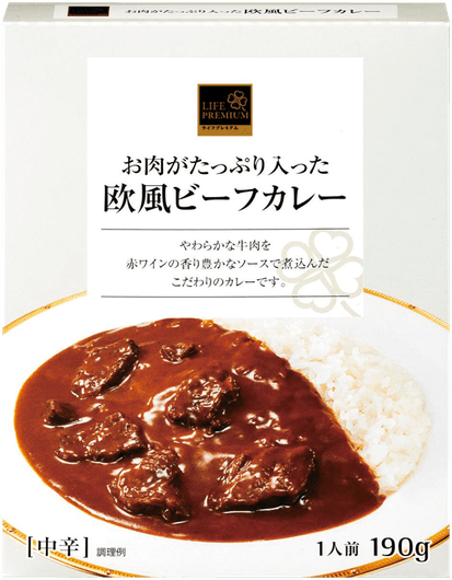ライフプレミアム「お肉がたっぷり入った欧風ビーフカレー」をベースにしたカレーは、ルウのコク・じっくりと炒めた玉ねぎや牛肉の甘みと旨味・ボルドー産ワインの香りをお楽しみいただけます。