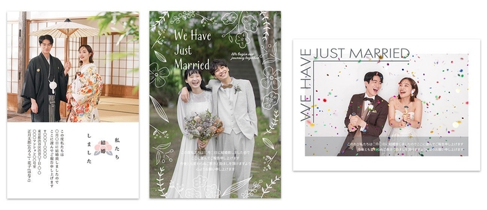 結婚報告はもちろん、感謝の気持ちを伝えるThank youレターや暑中見舞いなどさまざまなシチュエーションのはがきが取り揃えられており、和モダン・北欧・カジュアルなど、様々なテイストの中からご希望のデザインをお選びいただけます。さらに、おふたりだけのオリジナルデザインで作成することも可能です。