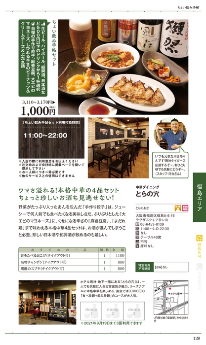 「ちょい飲み手帖」とは、有効期限の約4ヶ月の間、掲載店のオススメ料理とお酒がついた通常1,200円以上の「ちょい飲み手帖セット」がすべて税込1,000円で楽しめるグルメ本です。