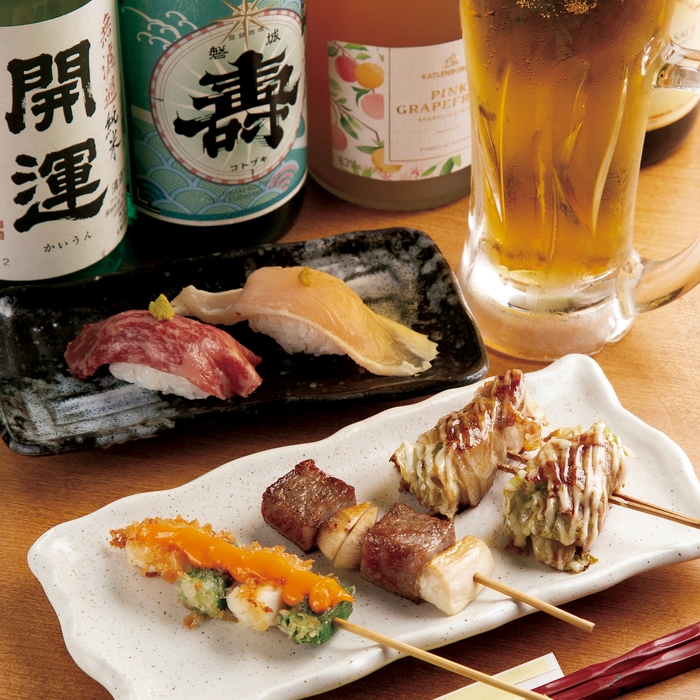 料理:名物くわ焼きおすすめ3本+黒毛和牛と地鶏肉寿司