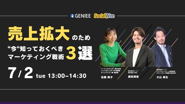 ソーシャルワイヤー株式会社(所在地:東京都港区、代表取締役社長:矢田 峰之)が提供するインフルエンサーPRサービス「Find Model(ファインドモデル)」は、2024年7月2日(火)に株式会社ジーニーの飯田海道氏、大山泰生氏をお招きし、認知施策(SNS広告/屋外サイネージ広告)から獲得施策(フォーム・サイト改善施策)まで新しいマーケティング手法について解説するセミナーを開催いたします。