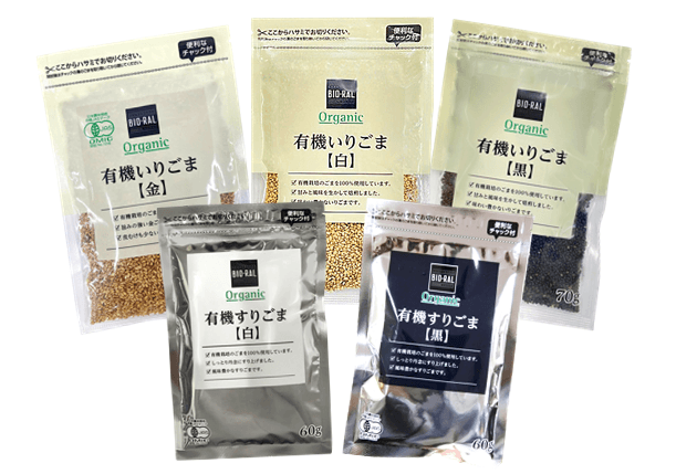 BIO-RAL 有機すりごま【白・黒】、有機いりごま【白・黒・金】 198円(税込213円)