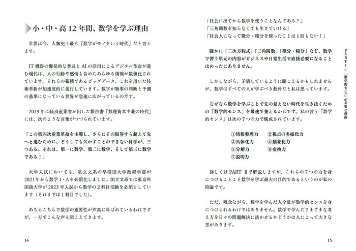 そこで本書では、数学的センスとはどういうもので、どうすれば身につくのか、この1冊を読めばわかるように解説していきます。数学が苦手な人でも、数学で挫折した経験がある人でも、中学や高校の数学の授業とはまったく別物の内容ですから安心してください。