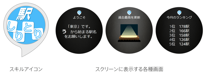 「Amazon Echo Spot」に向けて開発した「駅しりとり powered by 駅すぱあと」では、Alexaが読み上げた駅名と最後の文字や、ランキングの一覧を「Amazon Echo Spot」のスクリーンに表示します。ゲーム効果音とスクリーン演出で、より一層楽しめるスキルとなっています。