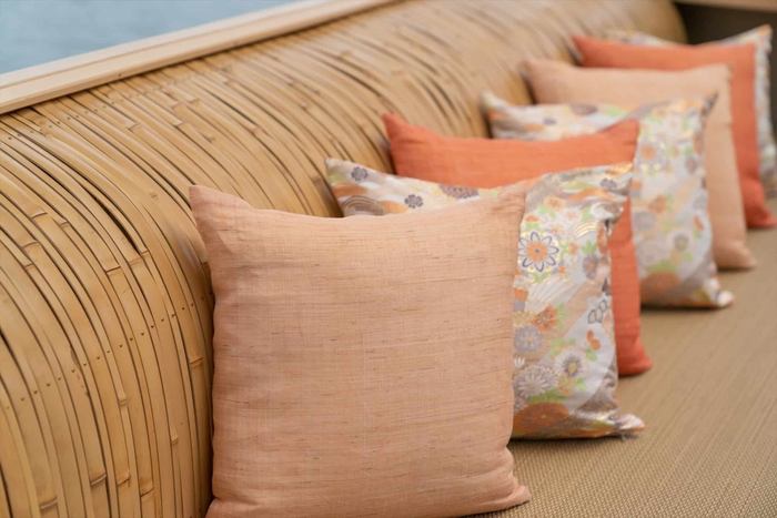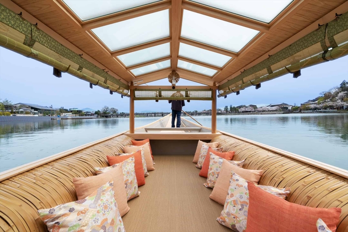 雅な屋形舟「翡翠」を貸し切り、プライベートな空間でくつろぎながら舟遊びを楽しむことができます。翡翠は、京都で古くから親しまれてきた建材や装飾を用いて京都の伝統工芸に囲まれる雅な空間に仕上げた星のや京都専用の屋形舟です。例えば、舟枠には書院造に用いられる北山杉やヒノキ材を使用し、木材の先端を覆う木口かくしには、古くから寺院などの柱や天井の装飾に見られる銅の金具を用いました。舟内には京町屋の犬矢来をイメージした竹の背もたれや、草木花で染め上げた柔らかな風合いのクッションを設えています。また、舟の側面の御簾を降ろすことでプライベートな空間を楽しむこともできます。また、翡翠の屋根には特殊なガラスがはめ込まれており、スイッチを押すことで、雪見障子を開けるように白から透明に色が切り替えられます。嵐山の渓谷と青空を見上げて楽しむことができる、これまでにない屋形舟です。