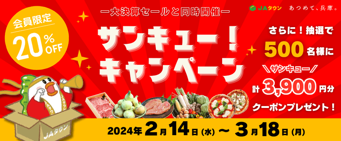 JA全農兵庫が運営する、産地直送通販サイト「JAタウン」内のショップ「あつめて、兵庫。」では、2024年2月14日~3月18日まで、日頃のご利用に感謝を込めて「サンキュー!キャンペーン」を実施します。「あつめて、兵庫。」ショップ内の対象商品ページに設置の20%OFFクーポンをその場で使用することでお得にお買い物できる他、期間内の当ショップ利用の会員様の中から抽選で500名様に2024年4月以降に使用可能な合計3,900円分の当ショップ専用クーポンをプレゼントいたします。