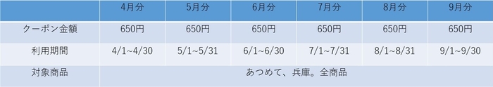 合計3,900円分のクーポンの利用期間は2024年4~9月で、各月650円分ずつご利用いただけます。ぜひこの機会に、当ショップでのお買い物をお楽しみください。