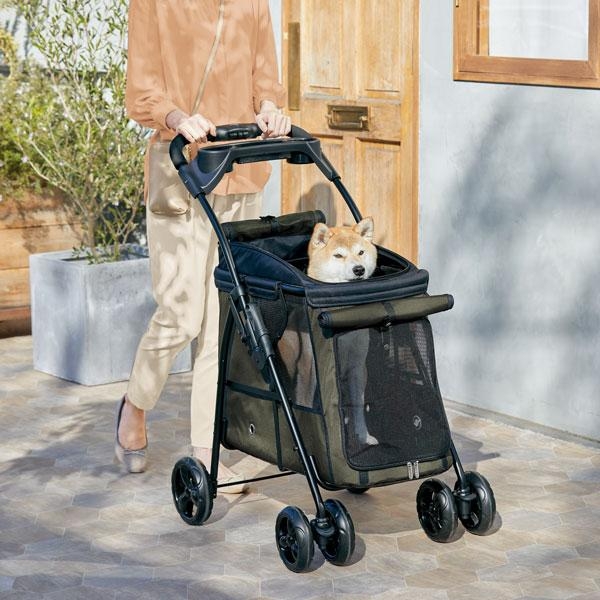 足腰の弱くなった愛犬とも一緒にお散歩しやすい、中型犬・多頭飼いでも ゆったり入れる快適カート。前面入り口が大きく開く低床バスケットで、愛犬自ら乗り降りしやすい設計になっています。