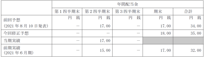 2022年6月期の期末配当予想につきましては、当期の業績動向に加え、内部留保の累積状況や資金需要動向等を総合的に勘案し、前回予想より1円増配し、1株当たり18円に修正することといたしました。