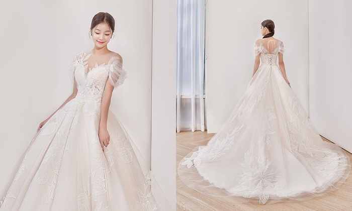 トップスの繊細で立体感あるビーディングのイリュージョンレースは、うっとりするほどの美しさ。ドレス全体に施された銀糸のビーディングデザインは、スカートが広がるたび優雅に輝きます。