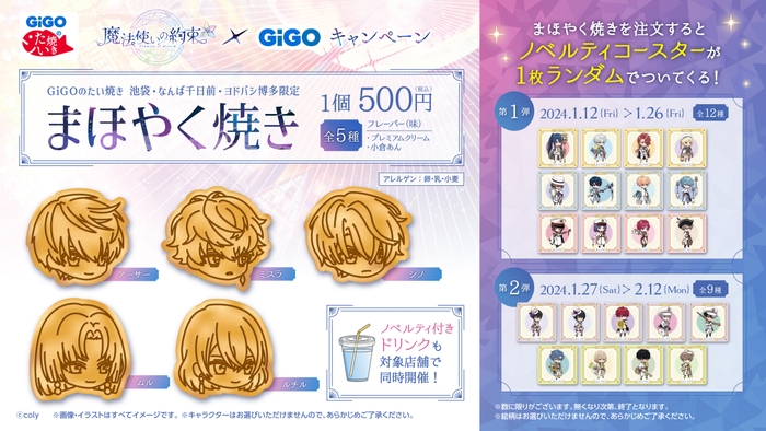 GiGOのたい焼きにて、『魔法使いの約束』に登場する5つの国の魔法使いをモチーフにした「まほやく焼き」を販売いたします。「まほやく焼き」ご購入1点につき、前後半に期間を分けてオリジナルコースター(前半:12種/後半:9種)をランダムで1枚進呈いたします。