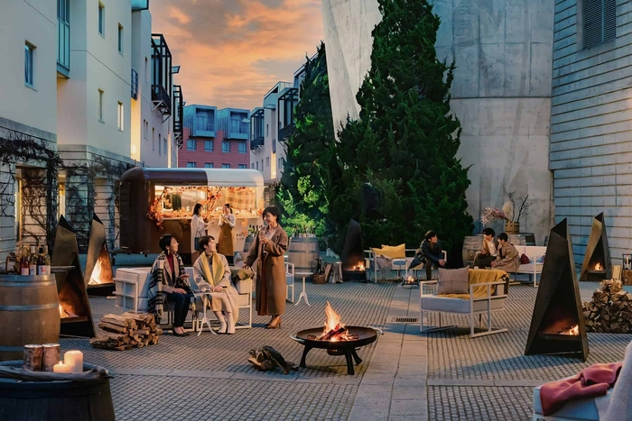 「焚火ワインサロン」は、メインストリート「ピーマン通り」にオープンします。焚火を囲んで炎の揺らぎを眺めながら、ゆったりと過ごせる空間です。焚火の周りにはソファが並び、クッションやブランケットも用意します。秋の午後に、焚火で温まりながらリラックスしてワインを楽しむひとときを過ごせます。