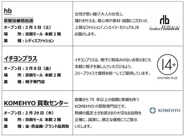 株式会社京阪流通システムズ(本社:大阪市中央区、代表取締役社長:松下靖)が運営する京阪電車・JR・Osaka Metro「京橋」駅前の商業施設・京阪モールでは、2024年2月から4月にかけて、京阪沿線初出店4店舗を含む新店8店舗が順次オープン、その他3店舗が店装を新たにし、リニューアルオープンいたします。