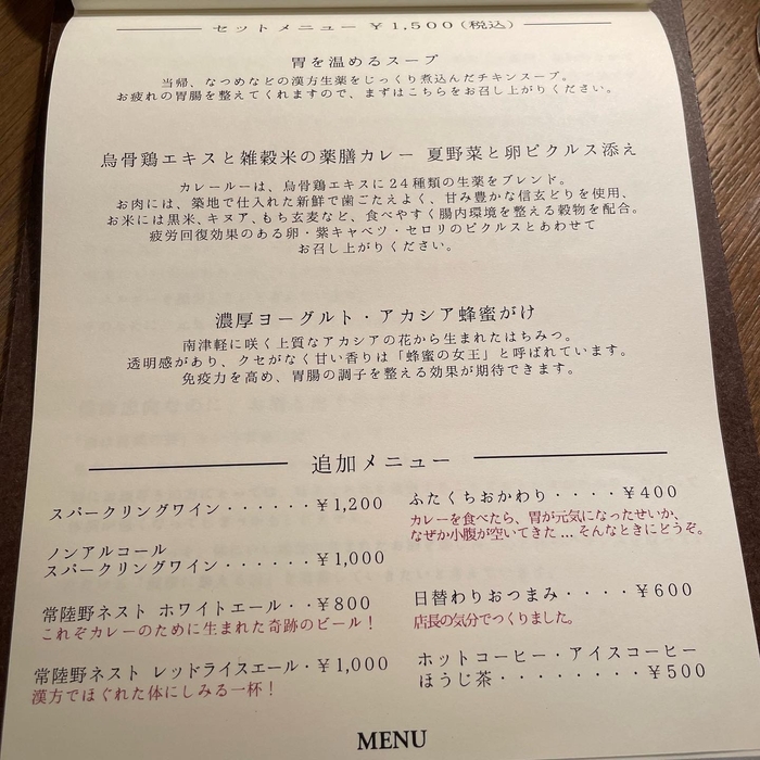 メニューは、薬膳カレーセット1500円一択とアラカルト少々。