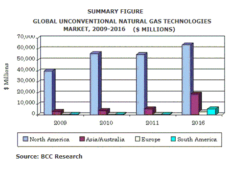BCCリサーチ社によりますと、世界における非在来型天然ガス抽出技術市場は2010年に約612億ドルに、2011年には約616億ドルに、そして2016年には8.2%の年平均成長率(CAGR)にて913億ドルに達する見込みです。