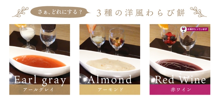 和スイーツの代表格とも言えるわらび餅の新たな可能性を追求し、フレンチのシェフがわらび餅と相性の良い洋素材のみを使用しこだわって作り上げました。ここでしか味わえない、アールグレイ・アーモンド・赤ワインの3種をご用意。トッピングとのマッチングもお楽しみいただけます。わらび餅は素材の香りが引き立つ出来立て熱々の状態でご提供いたします。寒い冬に心も身体もホッとくつろぐ、あったかとろ~り“ 洋風ホッとわらび餅 ”をぜひご賞味ください。