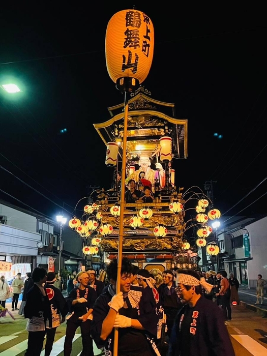 髪を結い、着物姿になった女子学生たちは、SNSで情報を発信したり、にぎわう街を練り歩いたりして祭りをPR。地元の婦人会が運営するカフェ「織カフェ」で接客や給仕などの手伝いもしました。日暮れ後も祭りのにぎわいは続き、午後7時からは提灯(ちょうちん)が飾られて「提灯山」となった曳山が幻想的に浮かび上がり、夜遅くまで市街地を練り歩きました。