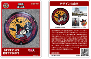 作成したマンホールカードでは、カープ坊やが福山藩初代藩主水野勝成公の甲冑を着用しており、背景には「令和の大普請」で天守北側鉄板張りを復元した福山城と、福山市の市章の由来である「蝙蝠(こうもり)」が描かれています。