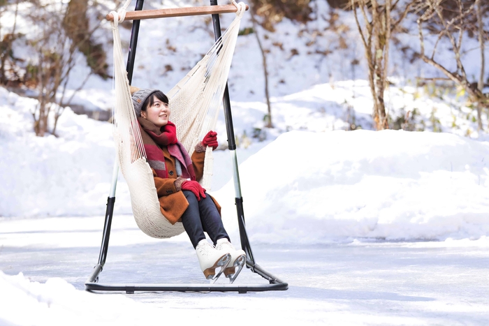 「自然と文化を愛する人々が集う場所「軽井沢星野エリア」にある屋外スケート場「ケラ池スケートリンク」では、天然氷エリアが結氷して2022 年 12 月 25 日に全面オープンします。天然氷エリアは冷却装置を使わず、冬の寒さだけで池の水を凍らせているのが特徴です。「森を感じるスケートリンク」をコンセプトとする本リンクでは、木々から舞い落ちて氷に閉じ込められた枯れ葉を探したり、冠雪した浅間山を眺めたりしながら、まるで氷上を散歩するかのようにスケートを楽しむことができます。今冬、天然氷エリアに新たに登場するのはチェアハンモックです。つい足元に目が行きがちなスケートの合間に、澄み切った冬の空をゆったり見上げる時間を提供します。