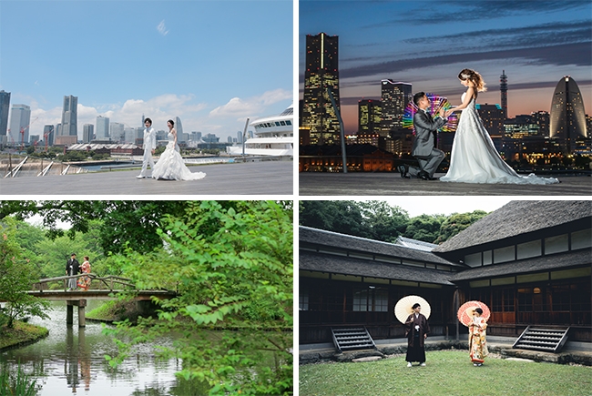 また、横浜みなとみらい店の周辺では、横浜の街並みを一望でき、夜景撮影のスポットとしても人気の「大さん橋」や、広大な敷地で風景を楽しみながら撮影できる本格日本庭園「三渓園」など、フォトジェニックな撮影スポットが豊富。スタジオ撮影とロケーション撮影の組み合わせプランをご用意しているので、併せてお楽しみいただくことも可能です。