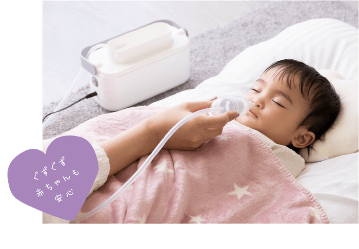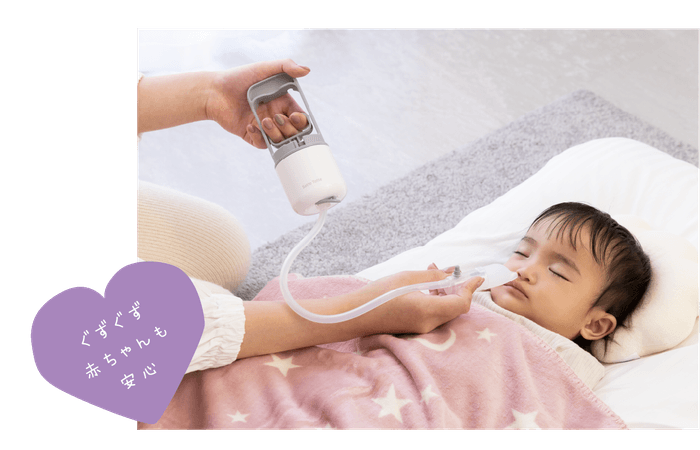 赤ちゃんが嫌がる大きな音がしないので、こっそり吸引できます。真空ポンプのパワフルな吸引力を実現し、奥の鼻水までしっかり吸引できます。