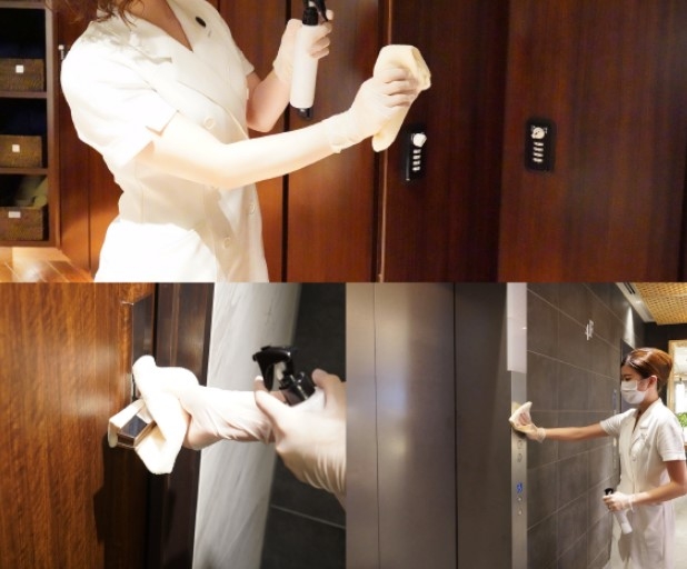 2. 受付、ドアノブ、ロッカールーム、ドレッサー、シャワールーム、トイレ等、お客様やスタッフが触れる場所についてはこまめに消毒作業を行っており、常に清潔を保っています