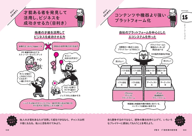 マンガも前作より大幅増量し、すごい経営者たちの意外なエピソードや、クスリと笑いたくなる失敗の逸話などを取り上げています。