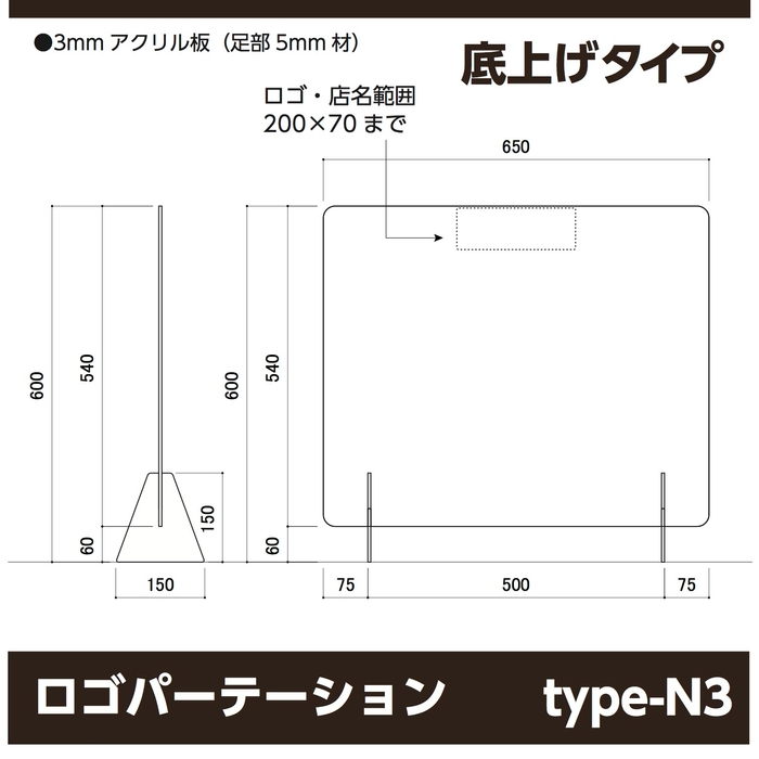 ロゴ・名入れ可能なパーテーションは全部で5種類。W650の標準タイプから、窓空き、底上げ、幅広のW900,W1200まで数多く取り揃えております。全て高さが統一されている為、組み合わせも自由自在。並べてもバラツキがありません。脚は差し込み式になっているので工具不要で簡単に設置が出来ます。